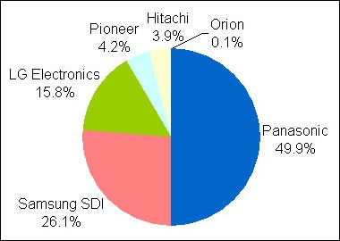 08年全財年的供貨量比上年增長26%,為1510萬枚,銷售額同比增長6%。供貨量的市場份額方面,松下為36%,三星SDI為29%,韓國LG電子為27%。如果09年上半財年先鋒和日立制作所退出的話,則PDP的主要廠商將減至3家。