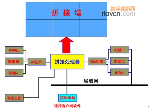 通過Cametoo拼接處理系統,除了可組織多臺各種顯示設備實現拼接顯示外,您還可方便地對各種信號源進行集中管理控制,使多個視頻信號、RGB信號、網絡電腦桌面、圖片文件在拼墻上以窗口方式進行顯示,通過控制中心軟件上的模擬窗口,可方便隨意地全屏移動、放大、縮小這些信號在拼墻上對應的顯示窗口。局域網中任一臺電腦都可當為控制中心,控制中心軟件可以對AV、RGB矩陣分別進行視頻、音頻、音視頻切換,可對拼墻(投影機)進行控制。提供AMX、快思聰等中控系統的控制接口,可使用中控的無線觸摸屏對信號進行拼接控制。