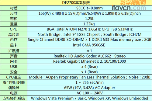 AOpen DE2700的數字告示播放器主機內部,采用了Intel ATOM N270 處理器,主頻為1.6GHz ,搭配Intel 945GSE Chipset主板芯片組,2GB DDR2的內存以及集成Intel 945GSE Chipset顯卡?偟膩碚f這樣配置雖不高端,不過勝在均衡合理,基本能夠滿足大部分數字告示系統的應用。
