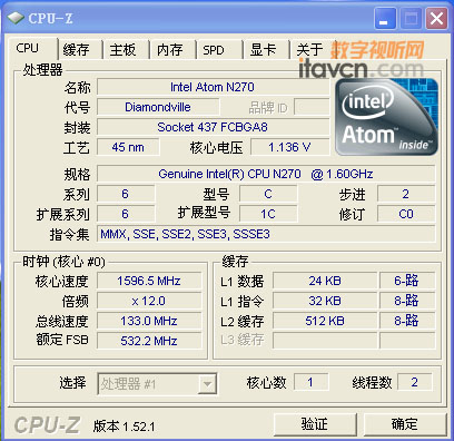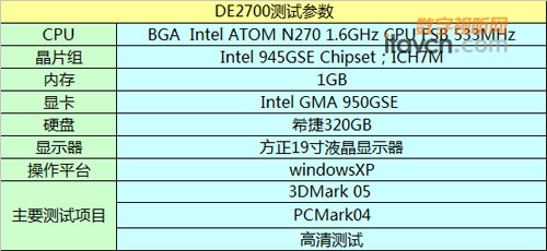 測試平臺,在處理器方面我們為DE2700搭配了性價比較高的Intel ATOM N270 1.6GHz 的處理器 ;顯卡方面,鑒于HTPC的應用,我們此次測試加入了高清片段測試項目,使用板載的950GSE集成顯卡進行測試;顯示器方面我們選擇了方正19寸寬屏液晶顯示器;內存使用了DDR2 533 1GB(內存為自行選配);操作平臺為Windows XP。
