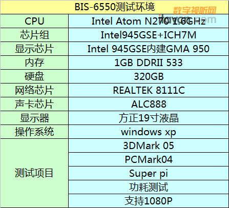 測試平臺,在處理器方面我們為BIS-6550搭配了性價比較高的Intel ATOM N270 1.6GHz 的處理器 ,顯示器方面我們選擇了方正19寸寬屏液晶顯示器;內存使用了DDR2 533 1GB(內存為自行選配);操作平臺為Windows XP。而在測試軟件部分,我們選擇了以DX 9經典游戲為主的游戲項目,因為在這種較老的游戲中,整合主板才能實現比較流暢的運行效果,并且加入最新的3DMARK 05作為理論測試軟件,此外選擇PCMARK 04作為系統整體性能測試軟件,對比對象為主流的幾款廣告機。