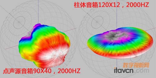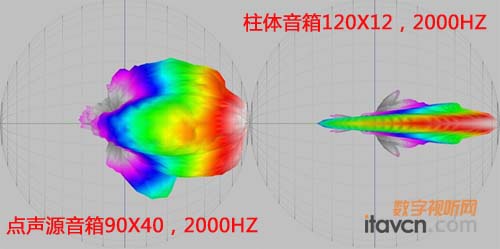 以這種應用為例,柱體音箱的另外一個重要優勢是抗回授(feedback)。通常,在使用點聲源音箱系統的會議室,或其他相似的應用環境,聲音系統容易產生回授。因為點聲源音箱有著擴散式的聲音傳播特性,或者說它不具備良好的覆蓋控制能力,所以很容易把過多的音箱直達聲傳送到麥克風所在的區域, 從而使聲音系統產生一個瞬態無窮大的信號回路, 也就是回授。柱體音箱正好相反,它具有超強的聲音縱向覆蓋控制能力,直達聲傳送軌跡容易控制,麥克風區域不會受到太多的干擾, 從而避免產生回授。 即使把麥克風放置在離柱體音箱特別近的地方,麥克風收到的聲音只是柱體音箱眾多驅動單元中一到兩個單元的直達聲。雖然這時麥克風收到的聲壓級很高,但它并不是整個柱體音箱的總輸出能量,所以也不容易產生回授。圖片3是點聲源音箱與柱體音箱在2000Hz 的三維球形聲音對比圖像。