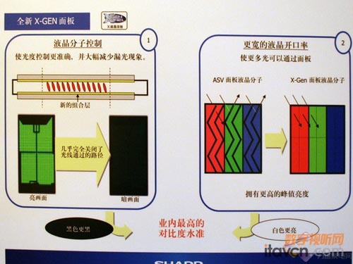 像素排列結構對液晶面板的顯示性能有較大的影響,夏普以往給人們的印象就是蜂窩狀像素結構,MPD像素分割設計對可視角度和對比度的提升有很大幫助,而在每個像素內部,以往用來分割液晶分子的間隔物勢必會減小液晶面板整體的開口率,而新的X-GEN液晶面板正是重新設計的排列模式,剔除了間隔物之后,整體開口率有較大提升,得到更高亮度,新的組合層讓液晶分子的控制更為精確,大幅度改善黑色畫面時漏光狀況,使對比度和視角都得到改善。