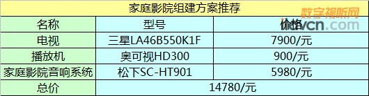 這個方案的一個亮點除了性價比高外還有個特點就是簡單,器材包括三星LA46B550K1F的大屏幕液晶電視,音箱選擇的是松下SC-HT901W 5.1聲道音箱系統(tǒng),里面的音箱有兩組6.5mm的低音擴(kuò)音器和6cm的高音揚聲器。而播放機(jī)方面選擇的就是奧可視HD300,和那些動輒幾千上萬的專業(yè)藍(lán)光比起來,奧可視HD300的價格可謂相當(dāng)平易近人,可以說是整套配置的一個亮點之一。