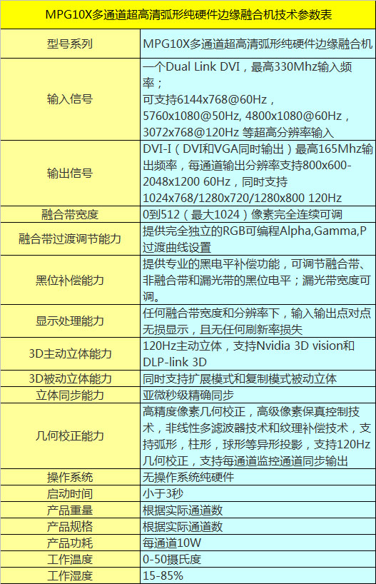 MPG10X超高分純硬件多通道曲目邊緣融合通道融合機(jī)基于專利的全硬件實(shí)時(shí)處理架構(gòu),對(duì)顯卡或任何視頻源的3D加速,視頻運(yùn)動(dòng)及圖形性能沒(méi)有任何影響和像素失真,采用真正的點(diǎn)對(duì)點(diǎn)顯示方式,且不占用任何CPU處理資源,因此無(wú)論是用戶運(yùn)行3D游戲、高清晰電影、數(shù)字地圖,實(shí)時(shí)渲染等都可以在整個(gè)超寬投影屏幕上完美呈現(xiàn),其點(diǎn)對(duì)點(diǎn)顯示分辨率遠(yuǎn)遠(yuǎn)超越傳統(tǒng)1080P的范疇,是業(yè)內(nèi)唯一能夠在雙通道DVI帶寬上實(shí)現(xiàn)全畫(huà)面點(diǎn)對(duì)點(diǎn)純硬件融合的解決方案,多臺(tái)投影機(jī)對(duì)計(jì)算機(jī)主機(jī)和顯卡來(lái)說(shuō)會(huì)被認(rèn)為是一個(gè)超大分辨率的單一屏幕,而所有融合帶的生成、融合帶圖像處理和非線性幾何校正則完全由MPG10X內(nèi)部的硬件可編程高速處理電路完成。