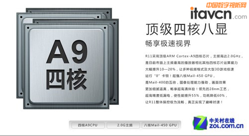 R11采用頂級ARMCortex-A9四核芯片,單核主頻高達(dá)2.0GHz,2GRAM和8GB存儲空間,硬件配置出色的同時軟件也是杰科的拿手好戲。R11內(nèi)置了華數(shù)正版平臺,擁有電影、電視劇、新聞、娛樂、欄目、體育、教育、時尚、音樂及點點樂園等十個欄目,近百萬小時的媒體資源庫,實時在線更新,滿足全家人的娛樂需求。