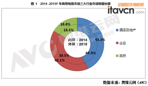 奧維云網(wǎng)(AVC)預(yù)計,2015年商用電視市場的三大行業(yè):酒店及地產(chǎn)、企業(yè)、政府的預(yù)測銷售比重為43.3%:40.1%:16.6%。