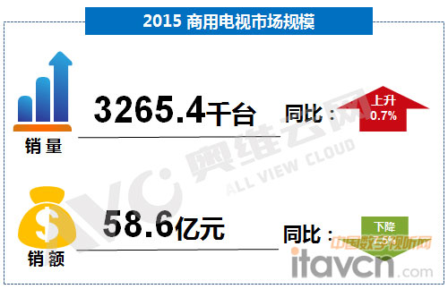 【中國數字視聽網訊】目前,中國商用電視市場發展已經相對成熟,2015年國內GDP同比增長6.9%,創近年來新低,與此同時,商用電視市場增長趨緩;根據奧維云網(AVC)全年市場監測數據顯示,2015年全年,商用電視市場整體規模達3265.4千臺,同比增長0.7%,基本持平;銷額58.6億元,同比下降7.5%,銷額的下降主要因為電視硬件成本一再觸底,利潤率持續降低,規模呈 “量增額降”態勢。