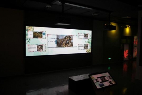 該展項采用2臺索諾克Sonnoc船長系列工程投影機SNP-DSW700,通過拼接融合的方式實現了4000*1380MM的超大畫面,結合Donview(東方中原)定制開發VIS交互軟件,為觀眾打造了一個高度互動的互動界面;參觀者可在輔助屏幕上選擇動植物環?破掌黝},利用VIS交互功能推送至主屏幕播放。