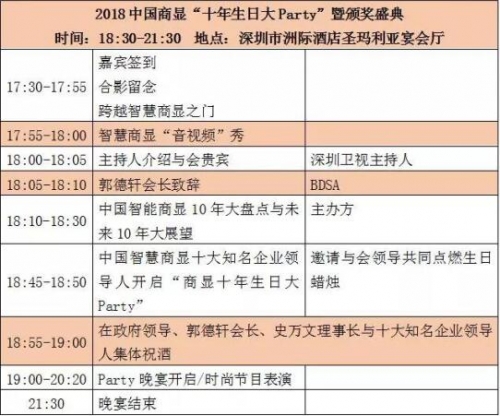 作為“商顯十年大慶”的CBDS 2018,肩負著歷屆領袖峰會的輝煌成就總結回顧與未來領袖峰會商顯趨勢的預測使命,「2018 中國商顯“十年生日大 Party”暨頒獎盛典」是其中必不可少的重要環節。“商顯十年生日大Party”活動議程如下: