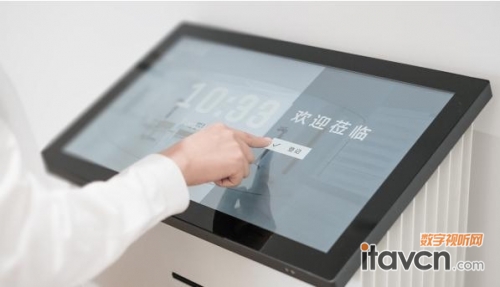 走進設計感十足的弧形玻璃門,映入眼簾的是TEOS自助接待系統與索尼BRAVIA 4K商顯方案結合的“智能前臺”。