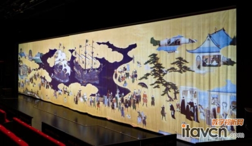 內容設計公司Naked Inc. 根據 15 世紀日本著名畫家狩野內膳的作品《南蠻屏風》為數字幕布創作了顯示內容。這種風格的屏風畫源自于 16 世紀末的安土桃山時代,描繪了從西班牙和葡萄牙等地的港口抵達日本的絢麗多彩的外國船只、建筑和人物。