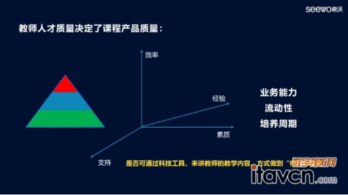 針對教培機構目前教師的水平不像金字塔一樣有序,相反,大家的授課能力是參差不齊的。這造成了拔尖的教師能夠備授非常優秀的課程,但中層以下的教師很難復制,主要原因是他們缺乏信息化的互動式的教學工具,作為標準互動課程的基礎,希沃的軟硬件信息化產品,能夠加速教培機構信息化升級,帶動教研產品標準化,實現品牌差異化的核心競爭力。