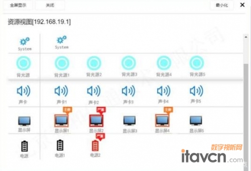 資源面板拓撲,圖像化展示顯示屏資源信息,包括顯示屏物理組件,如聲卡、背光源、電源等,也包括服務性能及客戶定義的其他監控對象,如:溫度、對比度、亮度、縮放模式、輸入信號分辨率等監控對象。