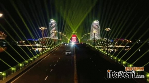 燈光秀期間,當游客沿著入島大橋步入;◢u,橋面兩側(cè)的光束迅速變幻著形狀,以動感的節(jié)奏,熱情歡迎著每一個登島游客,目之所及滿是節(jié)日特有的喜慶與活力。而整場燈光秀中,最為吸引人的,還是與大橋相呼應(yīng)的海花島雙塔。