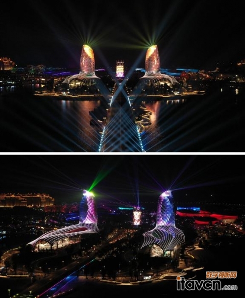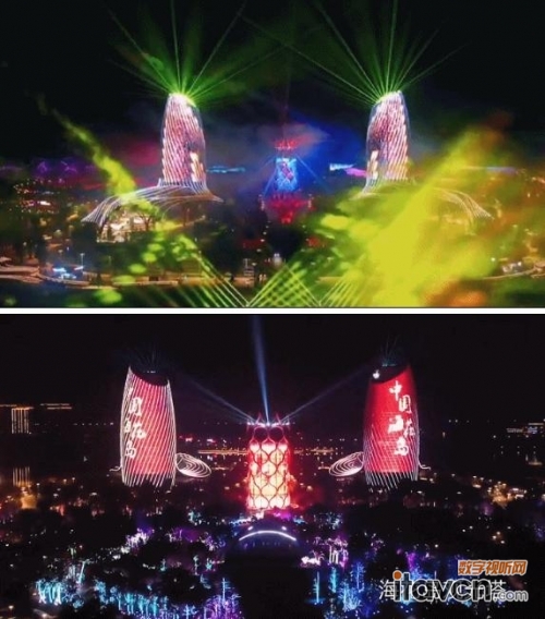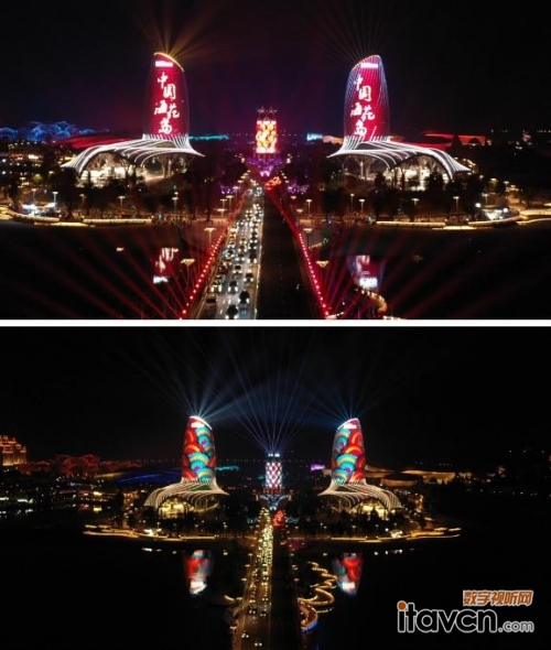 超酷炫!海花島雙塔創(chuàng)意燈光秀成“打卡”熱點