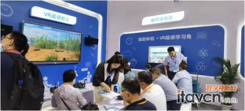 在VR超感學習角區域,與會者可以自助式體驗課程,自由漫游在知識的“海洋”,也可以瀏覽學校的最新動態,更可以來一次別樣的漫步校園之旅。