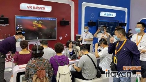 VR黨建主題成功吸引了眾多與會者,威爾文教展臺被圍得水泄不通。“VR黨建教室以集中授課的形式打造黨史學習大講堂,在這里可以體驗到四大主題板塊內容,即建黨100周年、偉大的革命戰爭、新中國成立71周年、革命圣地全景體驗。”產品經理在VR黨建教室中指導與會者如何操作體驗。