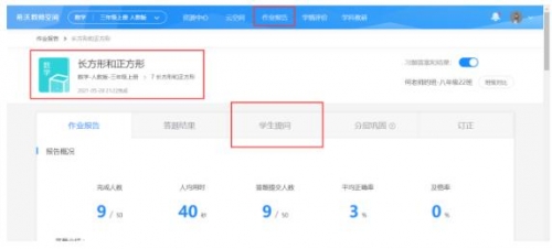 ④單元測試,分層練習:老師了解學生較薄弱學科知識點后,在教師空間挑選同步卷分發(fā)布置,或是將校內資源同步試卷通過自制答題卡讓學生進行答題檢測。在學生完成作答后,老師通過作業(yè)報告查看全班檢測數據,如每道題正確率、人均用時長及學生個人詳情等。同時老師可基于數據分析進行智能組卷,將不同難度的習題卷分層推送給各層次學生,讓每個同學都可以在原有的基礎上練習提升。
