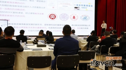 在活動現場,華南理工大學教育技術中心劉廣博士從教育變革與學習空間改造、高校智慧教室的建設規范、華工智慧教室的實踐三個維度,探究了信息化設備對教育改革的必要性。