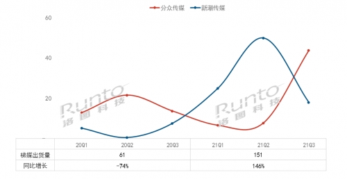 洛圖科技(RUNTO)發布的《中國大陸液晶數字標牌市場分析報告》顯示,2021年前三季度,梯媒液晶數字標牌產品出貨15.1萬臺,與同比增長146%。從訂單需求看,上半年以新潮傳媒訂單為主,從第三季度開始出貨轉向分眾傳媒。