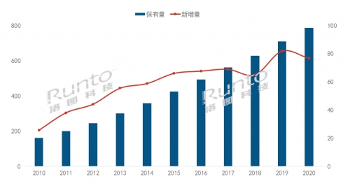2020年,中國大陸新增電梯77萬部,達到了787萬部。而十年前的2010年,中國大陸電梯保有量僅為163萬部,預測2021年將新增約100萬部。
