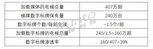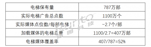 根據洛圖科技(RUNTO)調查,截至2020年底,電梯廣告點位數超過了1100萬個,假設按每個電梯約有2.7個媒體點位數,計算得出電梯的媒體覆蓋率為52%,即,一半以上的電梯已經介入了媒體信息發布。