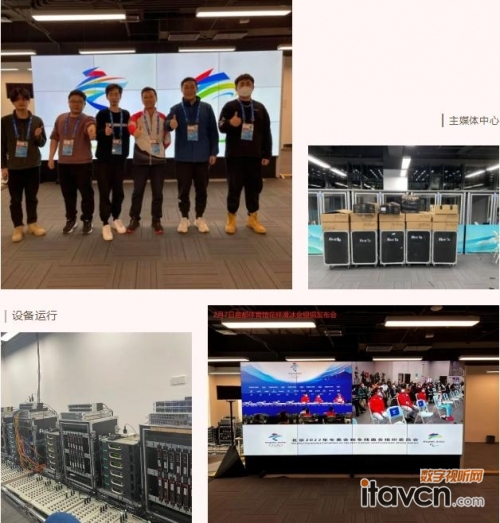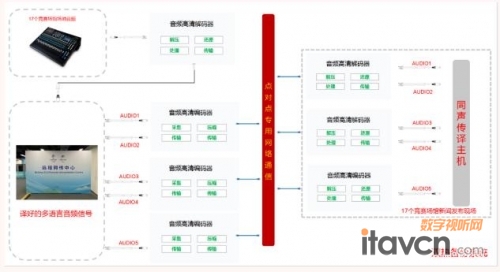 考慮到遠(yuǎn)程同聲傳譯中心的重要性,經(jīng)過(guò)多方論證、多次模擬演練,本次冬奧會(huì)音頻傳輸采用ACC格式「最大能容納48通道的音軌,采樣率達(dá)96 KHz,并且在320Kbps的數(shù)據(jù)速率下能為5.1聲道音樂(lè)節(jié)目提供相當(dāng)于ITU-R廣播的品質(zhì)」的編解碼盒子,支持音頻和視頻編碼、傳輸、解碼自動(dòng)校準(zhǔn)同步處理,在保證高音質(zhì)高畫(huà)質(zhì)前提下,實(shí)現(xiàn)音頻和視頻無(wú)延時(shí)同步,一方面各競(jìng)賽場(chǎng)館各項(xiàng)新聞發(fā)布活動(dòng)的聲音通過(guò)網(wǎng)絡(luò)音頻編碼器進(jìn)行編碼壓縮之后,通過(guò)單播RTP數(shù)據(jù)包(1對(duì)1傳輸)的方式將音頻流傳輸至同傳中心的網(wǎng)絡(luò)音頻解碼器,網(wǎng)絡(luò)解音頻解碼器接收RTP數(shù)據(jù)包解碼輸出至同傳中心,同時(shí)遠(yuǎn)程同傳中心翻譯后的音頻信號(hào)通過(guò)網(wǎng)絡(luò)音頻編碼器進(jìn)行編碼壓縮之后,通過(guò)單播RTP數(shù)據(jù)包(1對(duì)1傳輸)的方式將音頻流傳輸至各競(jìng)賽場(chǎng)館的音頻高清解碼器,由音頻高清解碼器接收RTP數(shù)據(jù)包解碼輸出至各個(gè)競(jìng)賽場(chǎng)館的新聞發(fā)布會(huì)現(xiàn)場(chǎng),實(shí)現(xiàn)同聲傳譯中心接收多個(gè)比賽場(chǎng)館新聞發(fā)布會(huì)的現(xiàn)場(chǎng)視頻信號(hào)和現(xiàn)場(chǎng)音頻信號(hào),及實(shí)時(shí)向各競(jìng)賽場(chǎng)館的新聞發(fā)布會(huì)的聽(tīng)會(huì)區(qū)域傳輸同步翻譯的音頻信號(hào)。