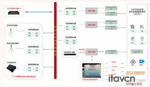 主新聞媒體中心通過(guò)點(diǎn)對(duì)點(diǎn)專用網(wǎng)絡(luò)通信技術(shù)連接所有競(jìng)賽場(chǎng)館,整體系統(tǒng)采用雙機(jī)熱備機(jī)制,系統(tǒng)運(yùn)行時(shí)節(jié)點(diǎn)和服務(wù)器出現(xiàn)故障時(shí),可實(shí)現(xiàn)無(wú)延時(shí)自動(dòng)快速切換;分布式編解碼盒子采用H.264/H.265、AAC/G711編解碼技術(shù)。以雙電源、雙網(wǎng)絡(luò)的備份的形式,將17個(gè)場(chǎng)館的發(fā)布會(huì)現(xiàn)場(chǎng)拍攝的多角度視頻(運(yùn)動(dòng)員、記者)和現(xiàn)場(chǎng)音頻通過(guò)高清編碼器穩(wěn)定傳送至主新聞媒體中心,主新聞媒體中心的信號(hào)經(jīng)過(guò)遠(yuǎn)程同聲傳譯中心翻譯后的音頻信號(hào)再通過(guò)高清解碼節(jié)點(diǎn)發(fā)送至比賽場(chǎng)館的新聞發(fā)布會(huì)的聽(tīng)會(huì)區(qū)域。同時(shí),通過(guò)INFO編碼器CH6A將17個(gè)場(chǎng)館的發(fā)布會(huì)現(xiàn)場(chǎng)拍攝的多角度視頻(運(yùn)動(dòng)員、記者)和多音軌音頻(現(xiàn)場(chǎng)聲 + 同傳)推送到北京冬奧會(huì)新聞發(fā)布會(huì)視頻服務(wù)系統(tǒng)(Info-AV),利用云計(jì)算的存儲(chǔ)、計(jì)算、網(wǎng)絡(luò)傳輸?shù)荣Y源音視頻流進(jìn)行合成、導(dǎo)播、制作及存儲(chǔ),并輸出具有多音軌的音視頻直播流,同時(shí)支持收錄和點(diǎn)播。