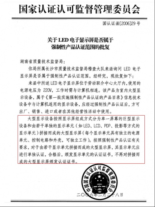 為此,對(duì)于LED顯示屏、DLP/LCD拼接屏等拼裝類的顯示設(shè)備的CCC認(rèn)證,2006年國(guó)家認(rèn)監(jiān)委曾就相關(guān)問題的釋義回復(fù)中給出了解答: