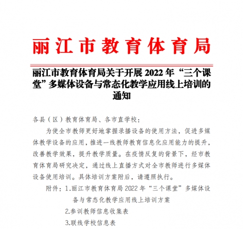 【數(shù)字視聽(tīng)網(wǎng)訊】為積極落實(shí)教育部印發(fā)的《關(guān)于加強(qiáng)“三個(gè)課堂”應(yīng)用的指導(dǎo)意見(jiàn)》,規(guī)劃和實(shí)施好教育均衡發(fā)展中的互動(dòng)課堂建設(shè),在設(shè)備落地后,積極推動(dòng)全市教師更好地掌握錄播設(shè)備的使用方法,促進(jìn)多媒體教學(xué)設(shè)備的應(yīng)用,并推進(jìn)一線教師教育信息化應(yīng)用能力的提升,改善教學(xué)效果,提升教學(xué)質(zhì)量。在疫情反復(fù)的背景下,麗江市教育體育局研究決定,于5月17-18日,通過(guò)線上直播的方式開(kāi)展全市教師的三個(gè)課堂與常態(tài)化教學(xué)應(yīng)用培訓(xùn)活動(dòng)。