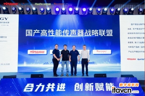 活動最后,方圖智能(深圳)科技集團股份有限公司董事長吳東亮先生,北京第七九七音響股份有限公司董事長、總經理李建偉先生,廣東雷蒙電子科技股份有限公司總經理孔杰鋒先生,恩平市海天電子科技有限公司副總經理張育銘先生共同上臺,四方攜手正式啟動國產高性能傳聲器戰略聯盟,并鄭重承諾,將嚴格落實中華人民共和國廣播電視和網絡視聽行業標準《GY/T373-2023-高性能傳聲器技術要求和測量方法》的具體要求,攜手打造國產高性能傳聲器,提高傳聲器產品的一致性和可靠性,促進電聲產業生產制造水平的良性發展。