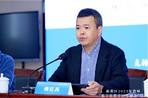 培訓的第一個議程,由新都區區委教育工委委員,區教育局黨組成員、副局長梅紅兵致辭,梅局長指出教育數字化轉型已經成為全國各地教育改革的重要方向,數字化轉型不僅能夠滿足學生多元化的學習需求,也為教師提供了更加便捷、高效的教學方式,提升教育教學質量。梅局希望參培教師可以通過兩階段完整的應用培訓,更新教學理念提升教學能力,做教育數字化轉型背景下的“新”教師。