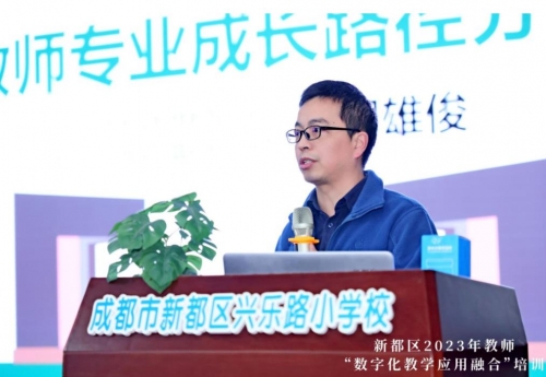 致辭結束后,由四川師范大學的周雄俊副教授作專題分享。周雄俊副教授帶來了《教育數字化轉型背景下教師專業成長路徑分析》講座分享,周教授提出在教育數字化轉型背景下教師應該轉變思維,有效地將信息化融合于教學場景和學習情境中。不是簡單的應用信息化將我們的教學變成一輛跑的更快的馬車,而是更多的將技術應用和教、學與教師發展相融合,讓學生的學習從被動變成主動思考,能夠讓學習真實地發生。為教育數字化背景下,教師專業成長指明了發展方向和路徑。