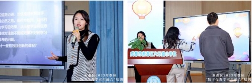 下午培訓的第一個議程由成都七中英才學校的余婧老師為老師們做了《數字化背景下的教學設計優化與創新》專題講座。在該專題講座中,余老師分享了她多年來的教學經驗和實踐成果。她首先介紹了信息化教育對數學教學的影響和應用現狀,討論了如何利用數字工具和資源進行數學教學的優化與創新。她詳細講解了如何應用希沃白板,設計富有互動性和啟發性的數學教學活動,以激發學生的學習興趣和提高他們的數學思維能力。