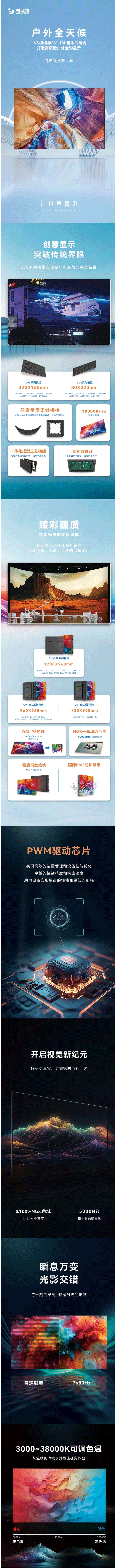 大家好,這里是利亞德「一期一會」欄目,繼續帶領大家感受顯示科技進步帶來的溫度與力量。利亞德高質量戶外全彩顯示產品隆重登場,開啟新視界。LVS系列與CV-18L系列的結合,專為戶外各種應用需求而設計;PWM驅動芯片的應用,幫助設備實現更高性能和更低能耗;同時,急熱極寒氣候也能輕松應對,為戶外應用場景帶來前所未有的視效體驗!本期,小編就帶大家一起走進利亞德LVS、CV-18L系列產品,一探究竟。