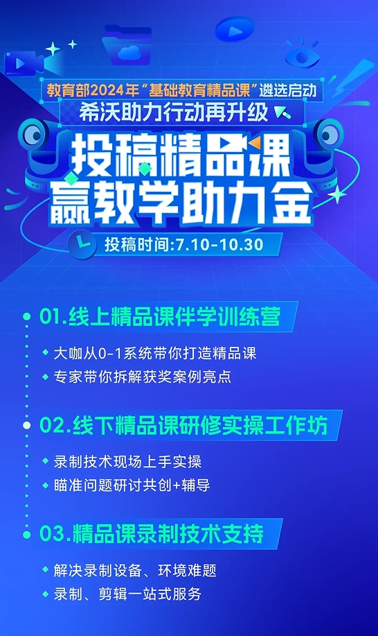 2024年7月,希沃啟動“基礎(chǔ)教育精品課助力行動”(以下簡稱“助力行動”),推出“線上精品課伴學(xué)訓(xùn)練營。”由全國信息化大賽一等獎獲得者橙子老師、部級評審專家賈進珠等大咖授課。課程涵蓋教學(xué)設(shè)計、AI工具應(yīng)用、虛擬場景搭建等模塊。