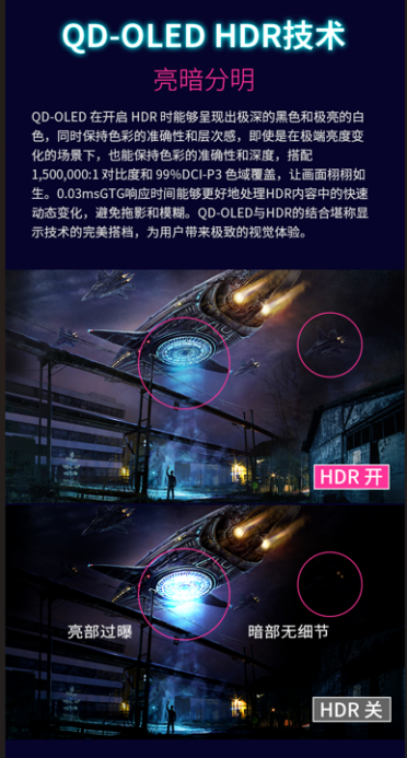 XG273-4K-OLED-2 顯示器還搭載了先進的 QD-OLED HDR 技術,亮暗對比分明。無論是極亮的光源還是深邃的暗部細節,都能精準還原,避免過曝與細節丟失。
