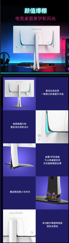 XG273-4K-OLED-2 不只是一臺性能強悍的電競顯示器,更是一件點亮桌面的藝術品。其白色雕刻后殼搭配星戰風格的流光燈效,營造出未來感十足的電競氛圍,成為桌面美學的新風尚。金屬設計的 Y 字形底座不只節省空間,還穩固可靠,配合可升降、旋轉的多功能支架,讓玩家在長時間游戲中也能保持舒適姿態。更貼心的是,包裝內還附贈隱藏款小鳥手辦,為你的桌面增添一份個性與趣味。