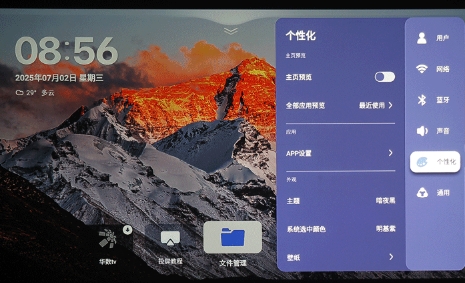 智能層面,明基W4100i在基于安卓開源系統的基礎之上進行二次開發,讓整個主界面保持干凈整潔,同時在系統內海嵌入了華數TV影視資源。