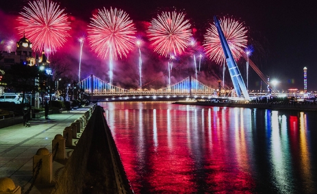 煙花夜景投影畫面中,將絢爛與細膩體現得淋漓盡致、完美融合。煙花綻放的色彩層次分明,紅紫交織間明暗過渡自然,每朵煙花的紋理、光芒都清晰可辨。橋梁與建筑的燈光、水面倒影相互呼應,暗部細節留存完整,亮部不過曝,讓夜景的深邃與煙花的璀璨相得益彰。