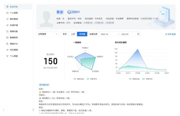 數字基座平臺無感采集教師在AI集備、聽評課以及課堂教學中的數據,并從師德修養、專業成長、教學常規和學生管理五個維度構建教師發展畫像。教師可以借助雷達圖對標成長模型,獲取個性化建議,從而為專業發展提供科學指引。教學管理者則通過電子檔案袋和多維數據分析,實現精準管理,同時為評優評職和管理策略調整提供客觀依據。