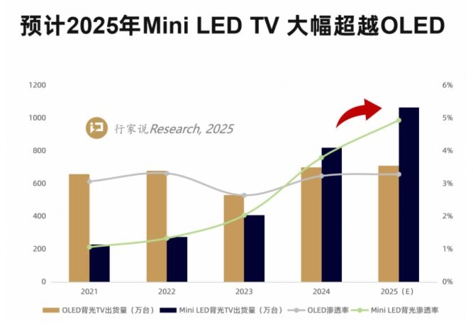 基于政策面明朗化與產業鏈策略端的協同效應,行家說Research預測,2025年,Mini LED TV出貨量將突破1000萬臺,滲透率破5%,將大幅全面超越OLED。