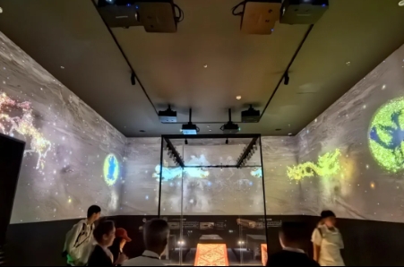 在《天地同和——中國古代樂器展》中,光影氛圍與靜態(tài)展陳巧妙交融,一個多維度的敘事空間就此誕生。因展品眾多,強(qiáng)光燈直射導(dǎo)致整體展項環(huán)境明亮,這無疑對投影機(jī)在高亮環(huán)境下的成像表現(xiàn)是一次巨大的考驗。