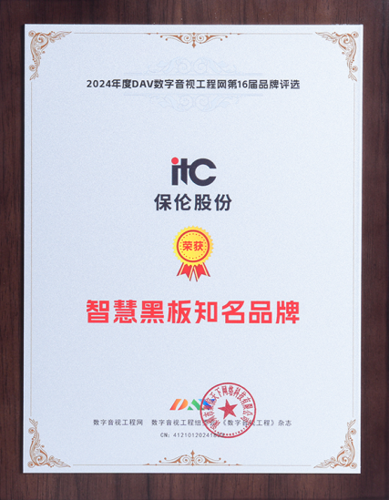 itc智慧黑板曾在第16屆音視頻行業品牌評選活動憑借強大的研發創新能力、品牌影響力、用戶滿意度、產品質量,成功摘得 “智慧黑板知名品牌” 桂冠!