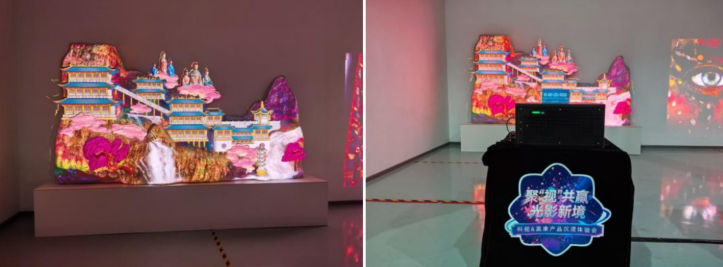 現(xiàn)場的3D古風(fēng)建筑雕塑投影同樣以精美的畫面效果,獲得了現(xiàn)場客戶的贊嘆,這個投影秀由M 4K+25 RGB 投影機演繹,它搭載先進的創(chuàng)新 RGB 純激光技術(shù),基于全新的 TruLife+™ 電子平臺,4K UHD+ 分辨率,支持電子色彩會聚 (ECC),擁有25300流明的亮度表現(xiàn),身形小巧,功能配置豐富,開創(chuàng)了科視Christie 3DLP RGB 純激光投影技術(shù)的新高度,M 4K+25 RGB 投影機不僅運行噪音超小,而且其亮度、色彩表現(xiàn)全都翻倍。
