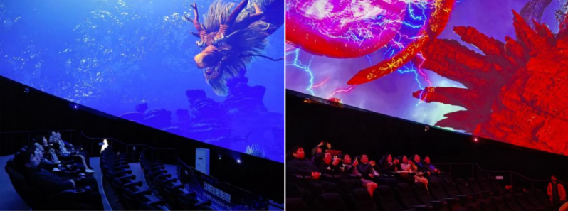 動感球幕影院是贏康自主研發(fā)的影院產(chǎn)品。影院中播放的影片是贏康原創(chuàng)山海經(jīng)主題片源《山海奇境》,以其 6K 30 幀的畫面,為客戶們呈上一場超沉浸式的視覺盛宴。動感座椅帶來的互動效果,與綺麗多姿的山海經(jīng)畫面相得益彰。一個神秘且美好的山海經(jīng)世界,宛如畫卷般在客戶眼前徐徐展開,讓這份沉浸體驗更加刺激與難忘。