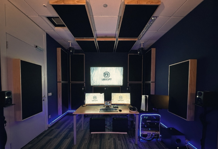 育碧新加坡在其3066平方米的辦公空間內設有三個音頻工作室,每個工作室專門針對游戲音頻制作的不同環節量身打造。Studio Red用作錄音棚,Studio Black則作為配音棚使用。之前被稱為Studio A的Studio Blue進行了徹底改造,從傳統的5.1設置升級為專為混音和素材制作設計的杜比全景聲7.1.4配置。