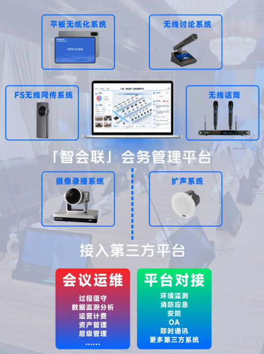 依托「智會聯」會務管理平臺,整合平板無紙化、無線討論、FS 無線同傳、攝像跟蹤、會議擴聲等會議子系統,同步接入第三方平臺,可實現辦公系統接入、環境監測、會場管理,方案兼具靈活部署、運行穩定、智能高效的核心優勢,可根據不同會議坐席安排靈活調整設備,全流程電子化操作提高會議效率,為政務會議構建高效、便捷、可靠的無線會議體驗。