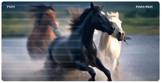 在刷新率方面, Infinity通過PAM 拓寬 PWM 調制的脈寬寬度,讓更多子場參與顯示,從而有效提升視覺刷新率。1 灰階刷新率較傳統 PWM 提升 4–8 倍,達到240Hz,360Hz,甚至更高,從而顯著減少閃爍,保證觀看舒適度。